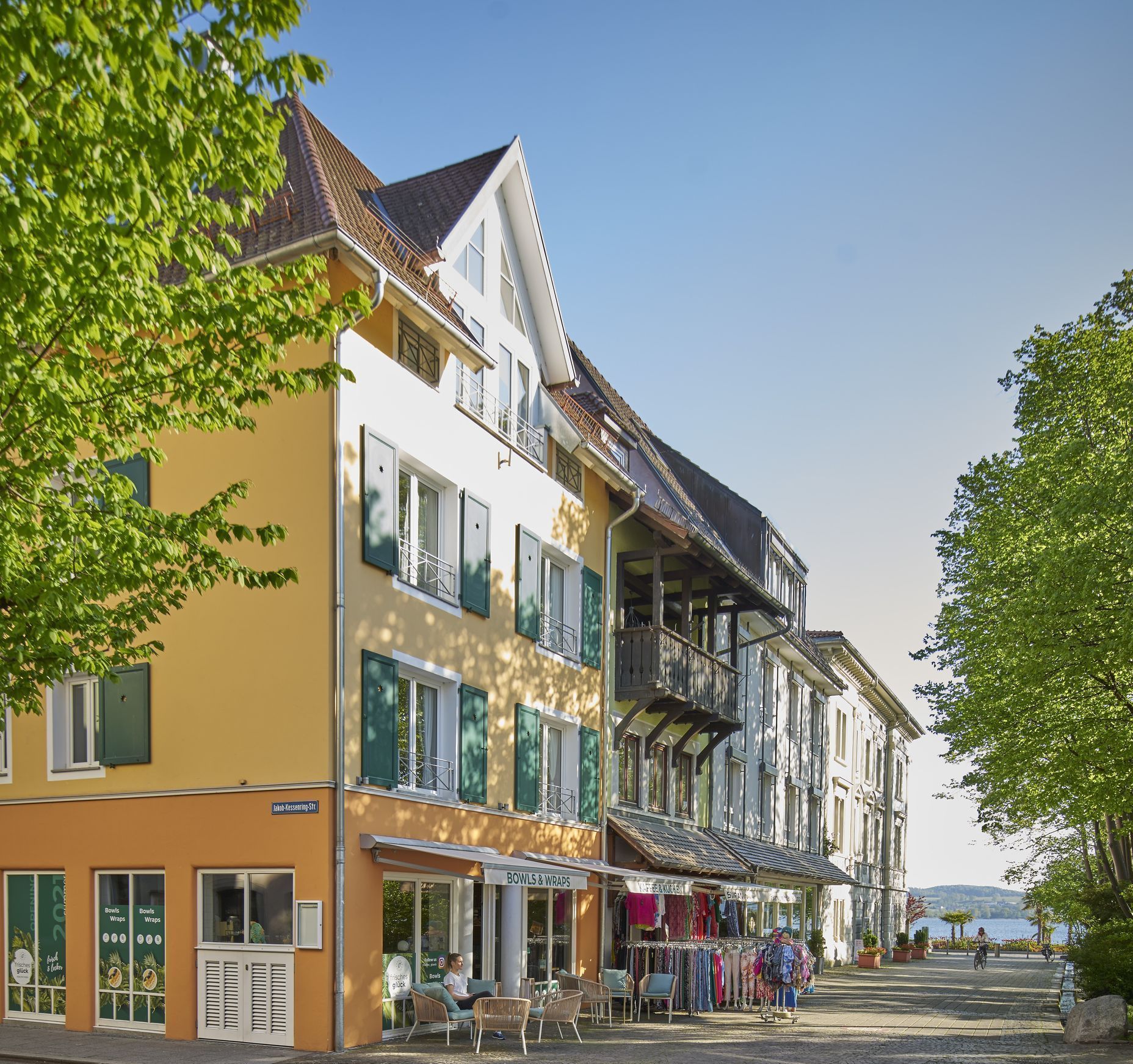 Unsere Apartments in Überlingen befinden sich einen Steinwurf vom See entfernt. Im Haus befindet sich ein Tagescafé. In wenigen Schritten stehst du direkt vor dem Bodensee an der Uferpromenade. Direkt gegenüber gelangst du in den wunderschönen Badgarten der an den Stadtgarten anschließt. Fußläufig kommst du in wenigen Minuten am Strandbad und der Therme vorbei, danach geht es weiter Richtung Uferpark. Zahlreiche Restaurants und Cafés findest du an der Uferpromenade.